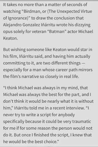 Checking out this hyped up new film, 'Birdman.' Excellent cast, but I keep looking for Philip Hoffman and can't find him. This film is custom built for his abilities. Btw, not the best film in the world but not a waste of time either. Reminds me of a rinsed out rendition of, 'Opening Night' without drunken Gena Rowland's dressed up as a flying chicken. Bye.. .